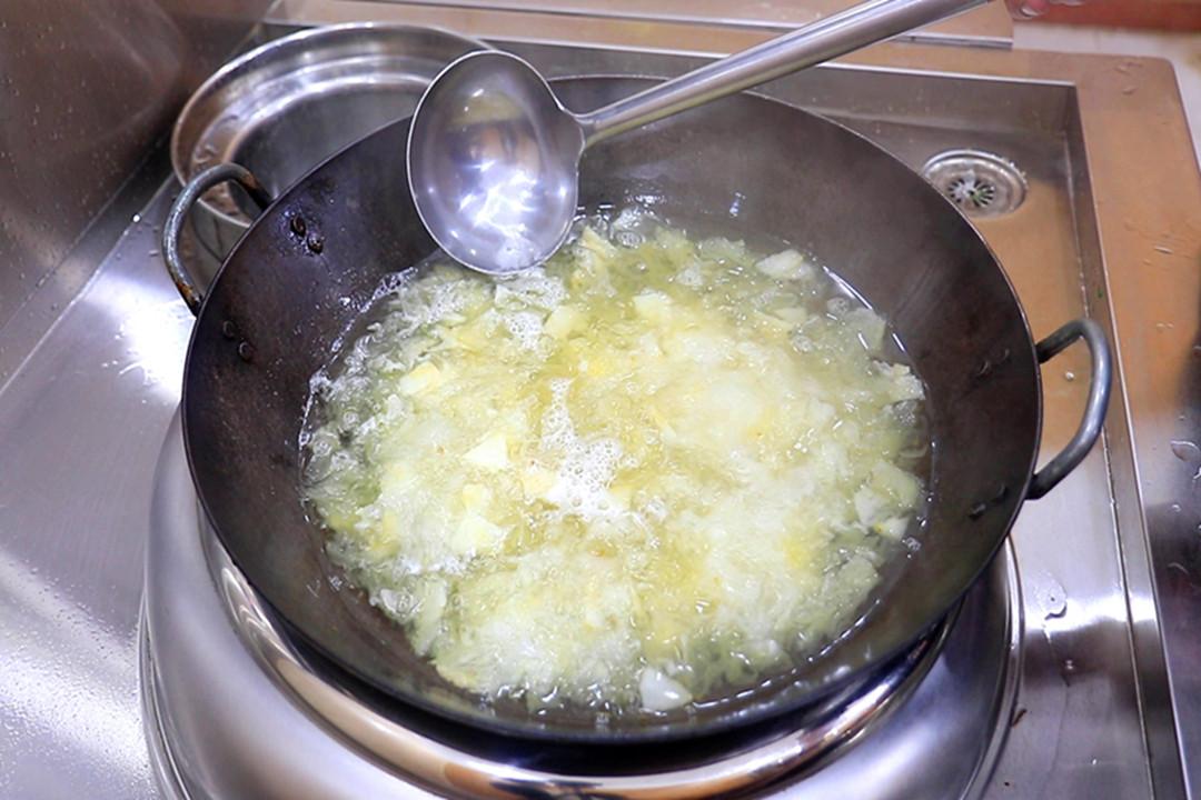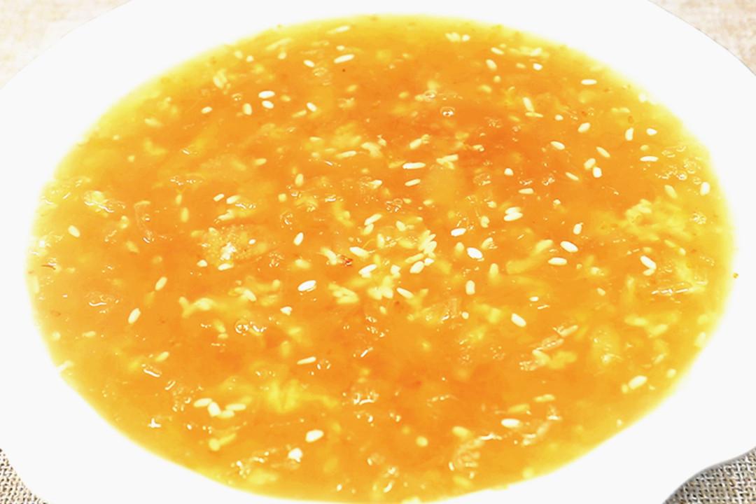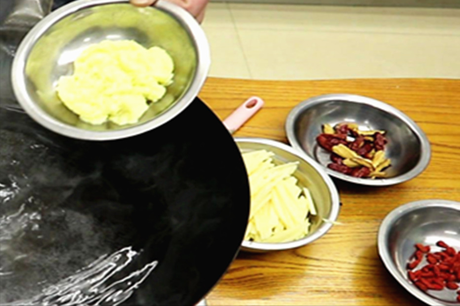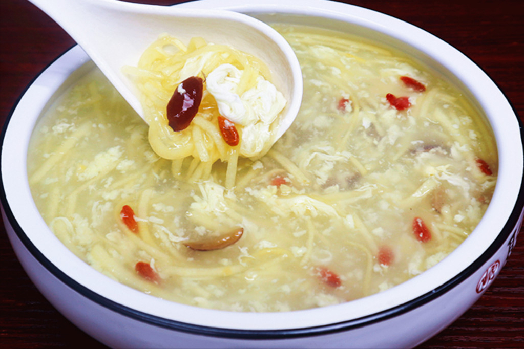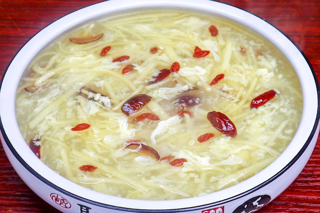 3.5分钟以后淋入一点水淀粉把汤羹调浓一些,淋上蛋液飘成蛋花,撒上枸杞子、美味即成。