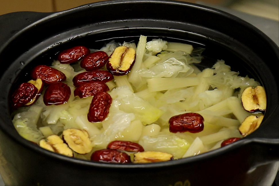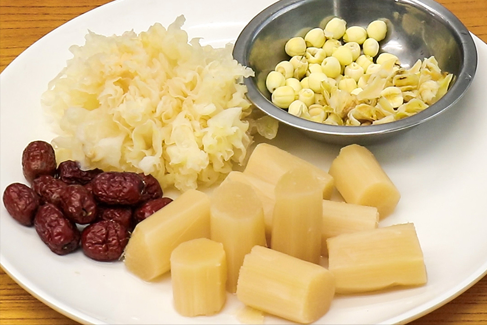 1.准备适量的甘蔗肉、切成小条;泡发的银耳撕成小朵;莲子和百合一起用温水泡软,然后把莲子芯去除,不然苦味太重;红枣洗净、破开去核。