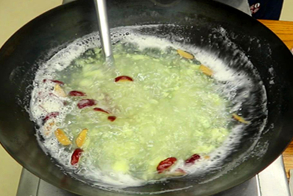3.时间差不多了,银耳已经起黏、色泽晶莹,这个时候把米酒倒进去,让酒糟的香气和银耳羹充分融合。