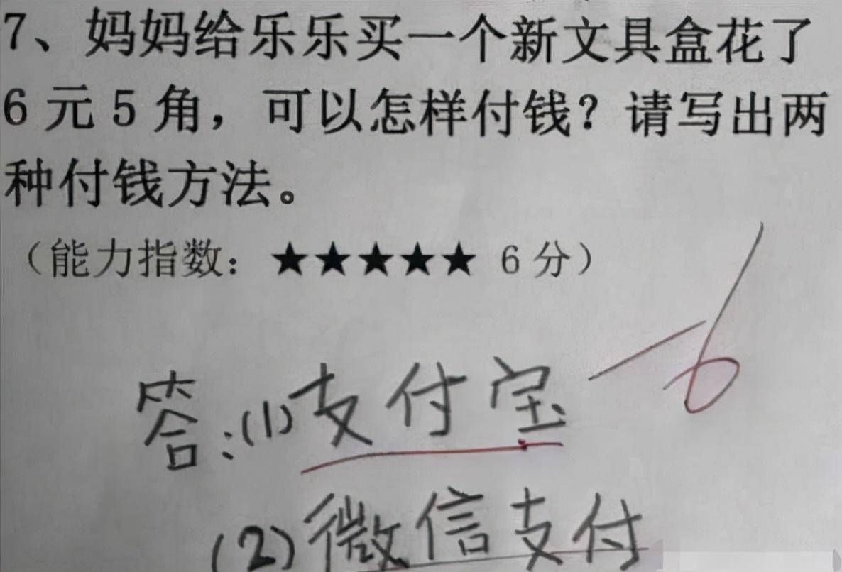 现在的学生对于手机支付方式也是太了解了,在考试中也念念不忘,题目本来是让学生给出不同的支付方式,他直接回答了“支付宝”和“微信”,真是让人无言以对。