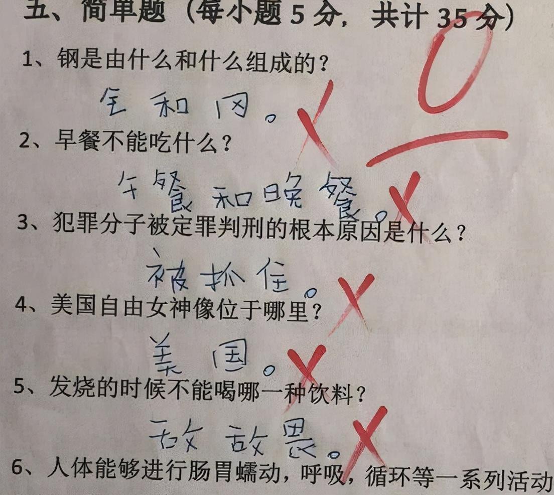 在一道简答题中,学生被问到钢是由什么组成的,他却直接回答,是由“全”和“冈”组成的,这回答也没毛病,就是不能得分啊。