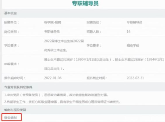 而这份招聘信息中,最受大学生们看重的不是薪资,而是华中师范大学给予辅导员岗位的正式编制。和很多大学的“无编”导员岗不同,如果在华中师范成功受聘,相当于有了“铁饭碗”,这无疑令人心动。