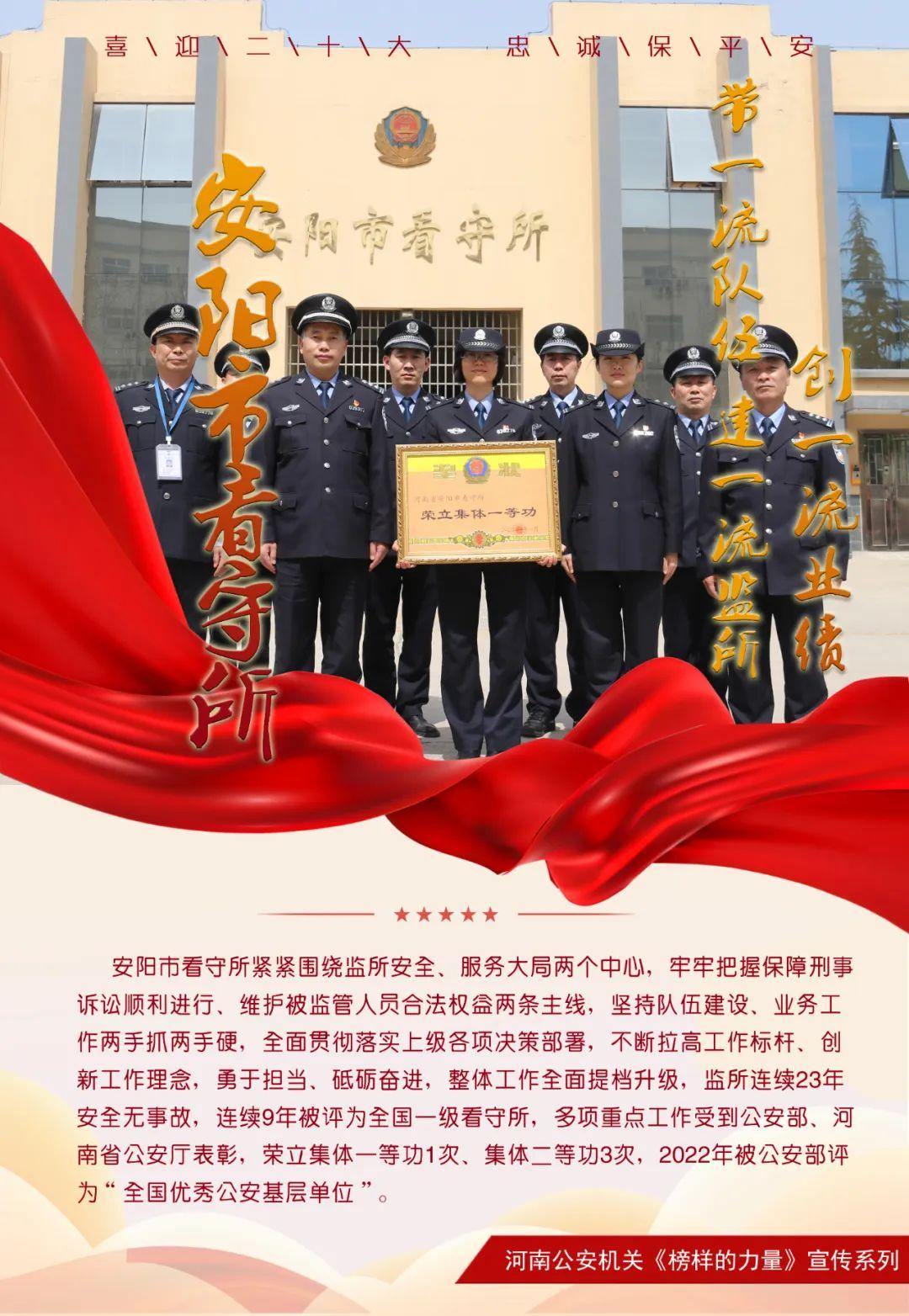 近年来,安阳市看守所紧紧围绕监所安全、服务大局两个中心,牢牢把握保障刑事诉讼顺利进行、维护被监管人员合法权益两条主线,坚持队伍建设、业务工作两手抓两手硬,全面贯彻落实上级各项决策部署,不断拉高工作标杆、创新工作理念,勇于担当、砥砺奋进,整体工作全面提档升级,监所连续23年安全无事故,连续9年被评为全国一级看守所,多项重点工作受到公安部、河南省公安厅表彰,荣立集体一等功1次、集体二等功3次,2022年被公安部评为“全国优秀公安基层单位”。