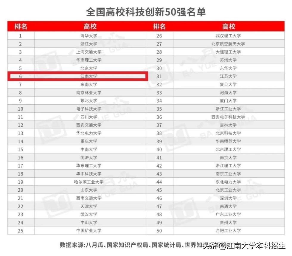 今年5月,由八月瓜创新研究院完成的《全国科技创新百强指数报告2021—企业、高校及研究机构篇》正式发布。江南大学位居全国第六,相较去年排名上升一位。