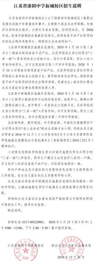 在淮中新城校区施教区范围内,2020年1月10日前(含 当日)购房并取得房屋不动产证,可以正常入学,还可自愿选择至第二开明中学就读;2020年1 月10日后购房,將按照房 屋不动产证取得时间的先后顺序录取,录满为止;超出的生源由生态文旅区社会事业局调剂安排入学,也就是调剂到二开;