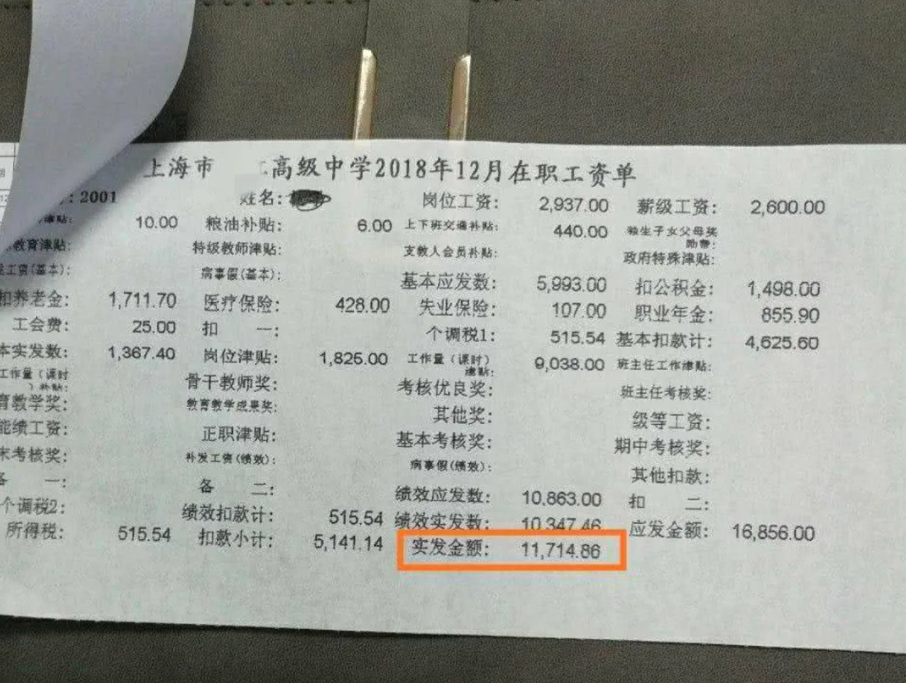 上海某高级中学的教师就晒出了自己的工资单,该教师的基本岗位工资只有2937元,薪级工资是2600元,但除此之外,还有其他的补贴,例如粮油补贴、岗位津贴、课时补贴等等,再扣除五险一金,实发工资是11714元。