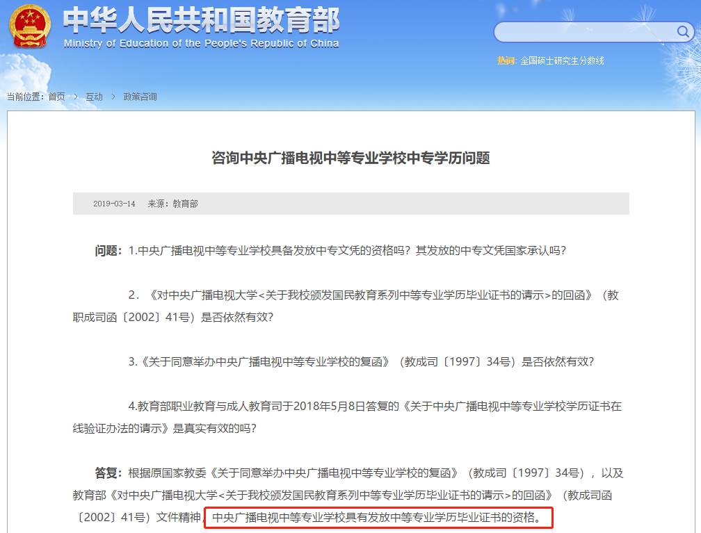 近日,关于中央广播电视中等专业学校是否具备发放中专文凭的资格等问题,对此,教育部在官网政策答疑作出了回应。