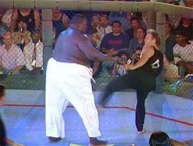 凯斯·哈克尼体重并不重,他代表的是空手道流派,成功利用了亚伯勒体重的劣势——身体转向较为笨拙,将亚伯勒击倒在地。