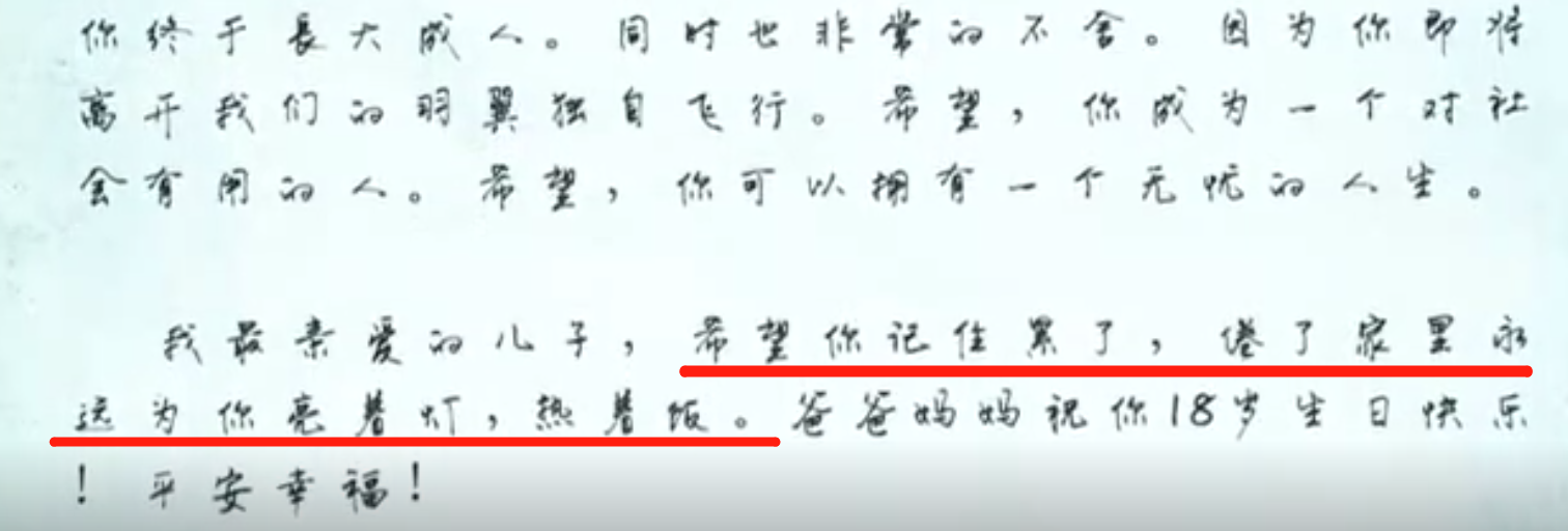 “我最亲爱的儿子,希望你记住累了,倦了,家里永远为你亮着灯,热着饭。”
