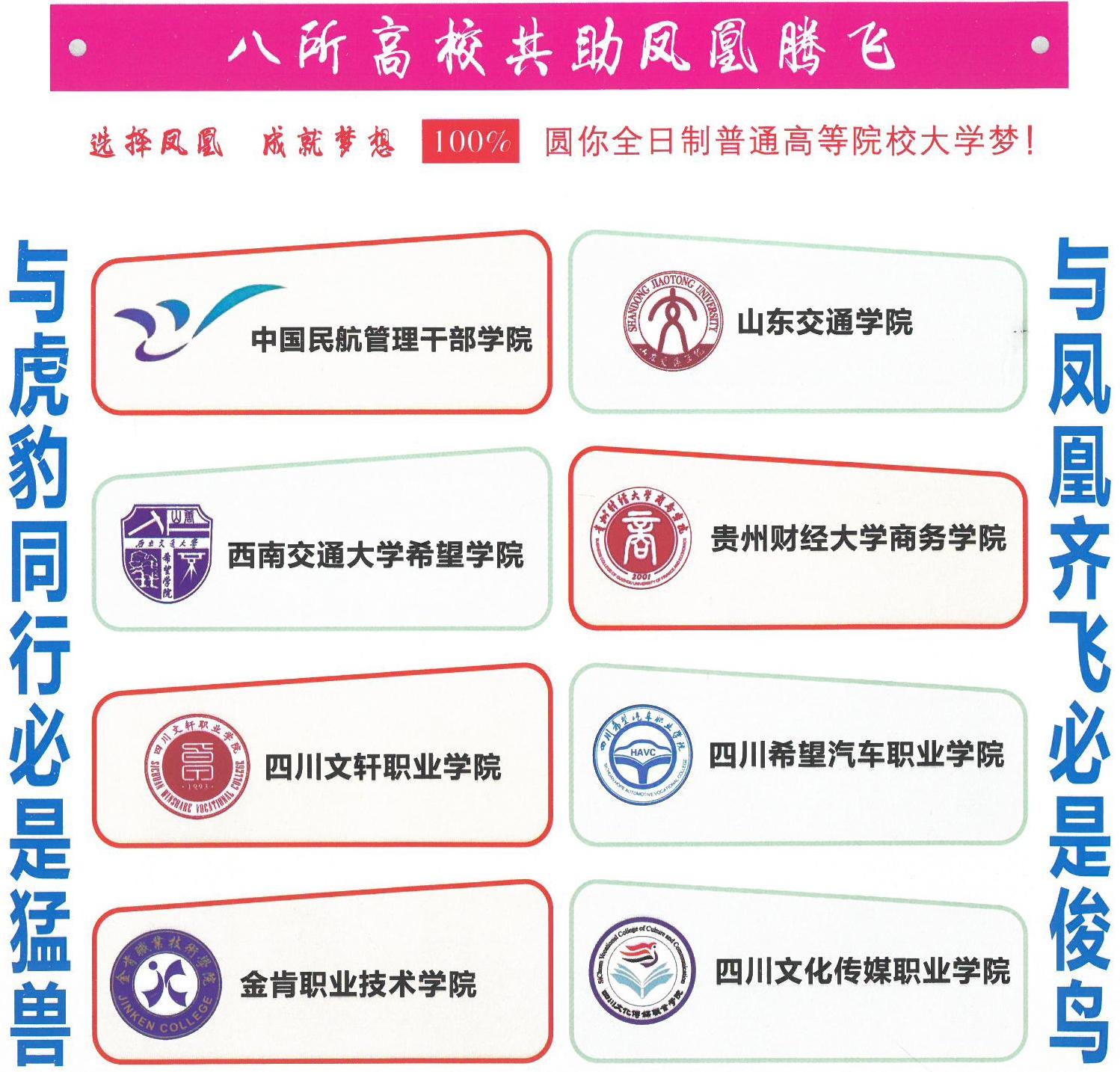 四川省达州凤凰职业技术学校与中国民航管理干部学院、山东交通学院西南交通学院、西南交通大学希望学院等多所全日制普通高校签订了联合办学协议,凡就读我校的学生通过国家统一高考均能被录取为全日制普通高等院校大学生,毕业后颁发全日制普通高等院校大学毕业证书。