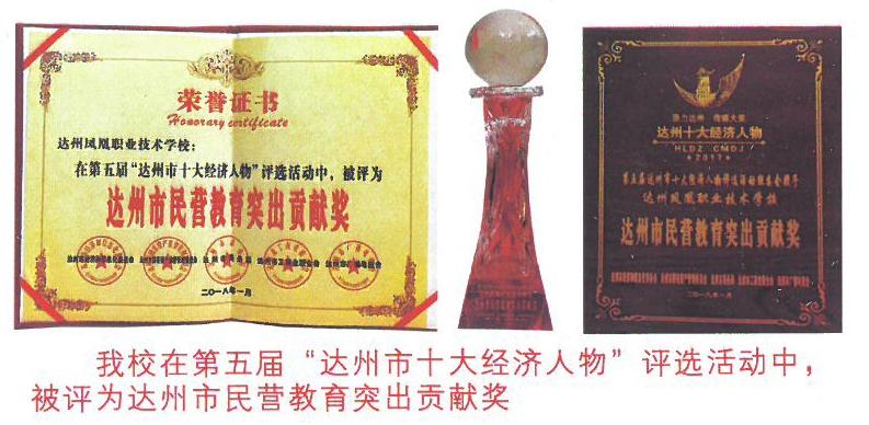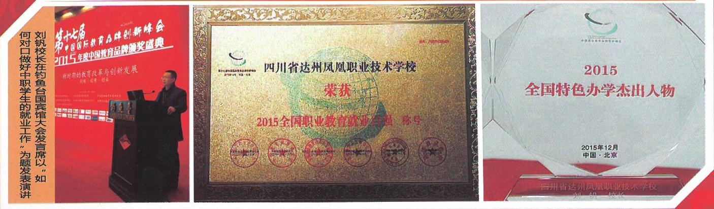 四川省达州凤凰职业技术学校一所让千万只凤凰腾飞的中职名校已在川东崛起,在第十七届中国国际教育品牌创新峰会暨2015年度中国教育品牌颁奖盛典大会上我校被评为“2015全国职业教育就业百强学校”,校长刘钒同志被授予“2015全国特色办学杰出人物”。