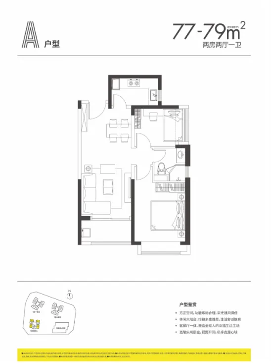 建面约77-79㎡的两房户型,对于预算有限的小家庭更友好,LDK+B一体化设计,空间更开阔。