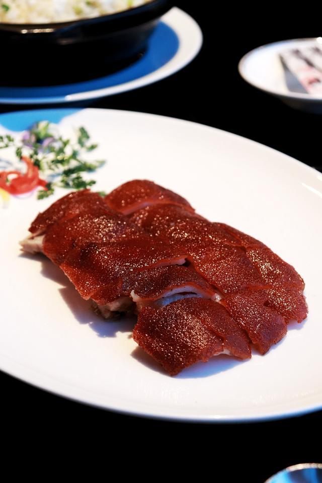 鸿运乳猪是首席招牌菜,选材肥瘦比例适中,通过慢火细作的耐心烧烤,烤去多余油脂后的“麻皮”松化香脆,鲜嫩的猪肉满溢出鲜甜的肉味。无论直接单吃、蘸白糖或甜面酱都各有一番风味。