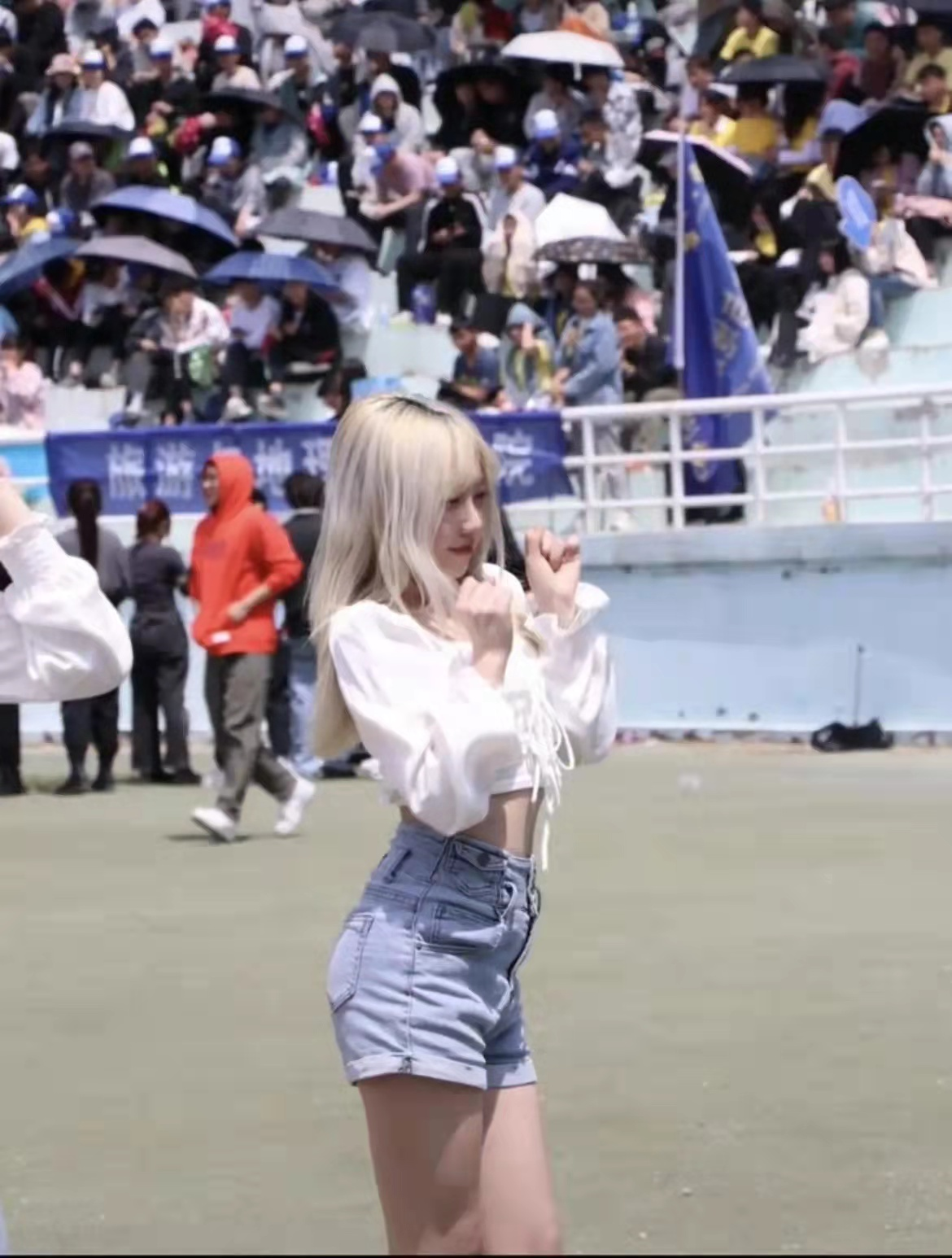 学校运动会的亮点便是举牌女生和啦啦队员,从照片中可见,这个女大学生身着清凉,上身穿着露肚脐的长袖,下身穿着热裤,头发是些许的黄白色,妆容精致,乍一看酷似“精灵”。