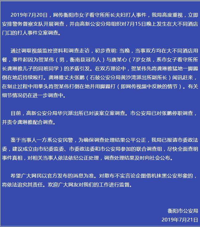 湖南省衡阳市公安局7月21日发布通报称,该事件系7月15日晚上发生在大不同酒店门口。目前,衡阳市公安局高新公安分局华兴派出所已对该案立案调查。市公安局已对张鹏停职调查,并责令龚琳雅配合调查。