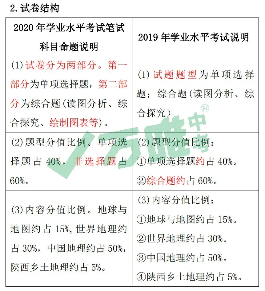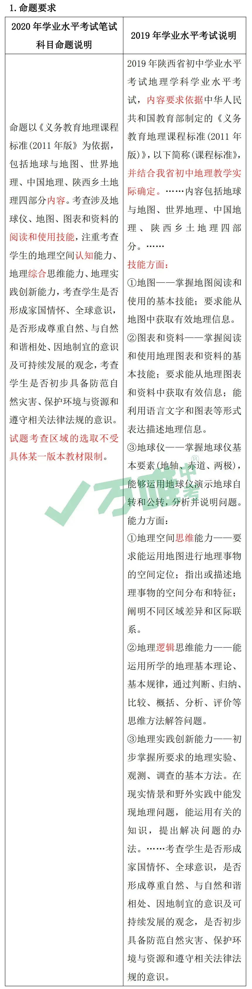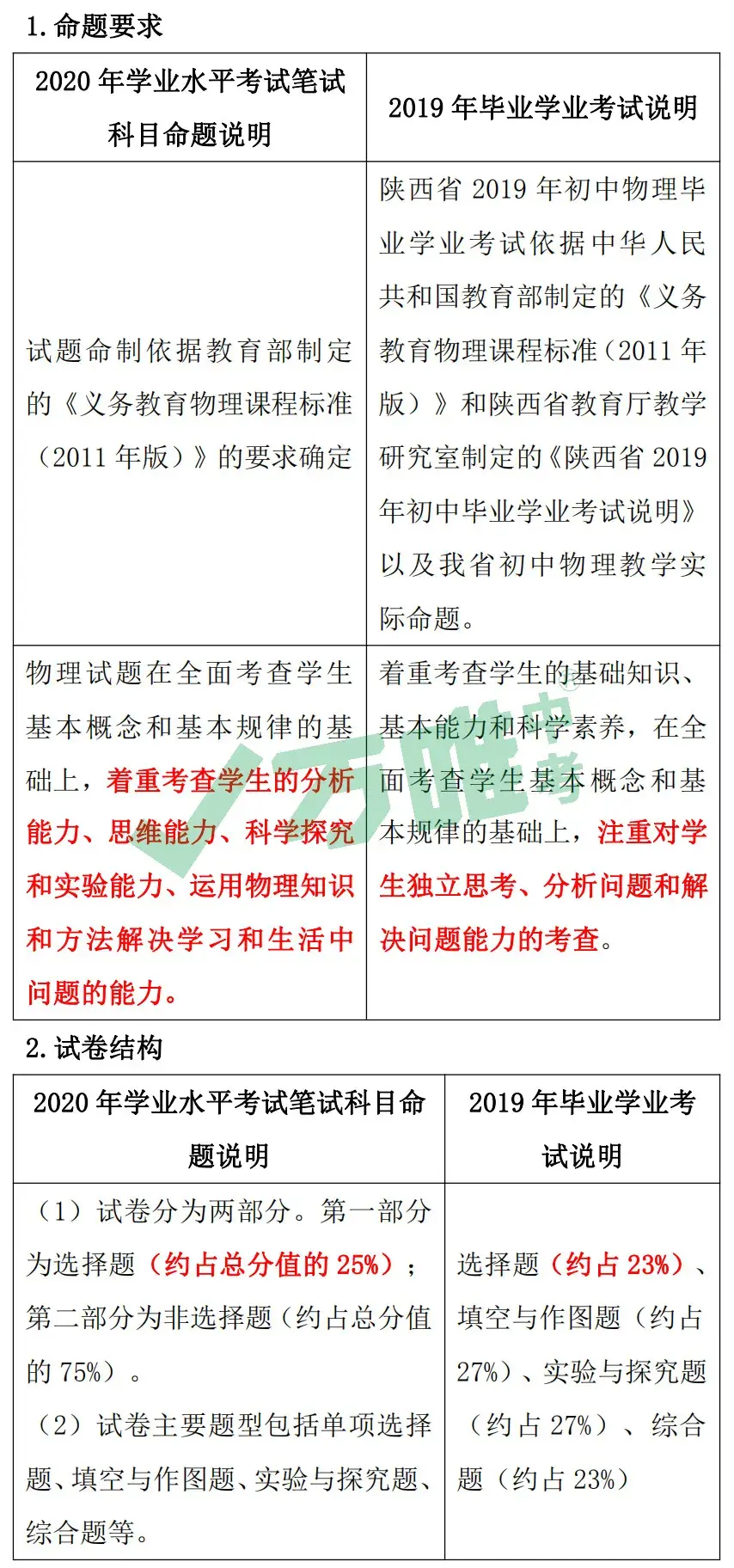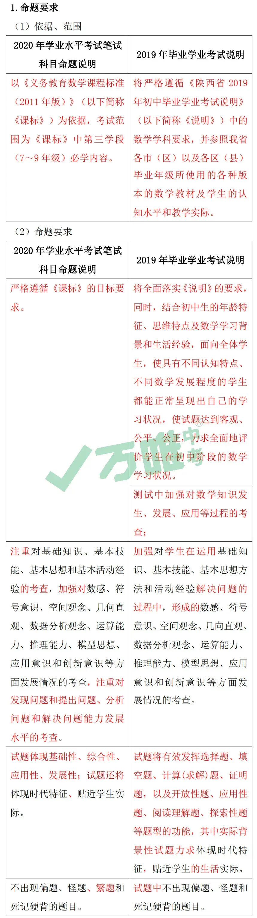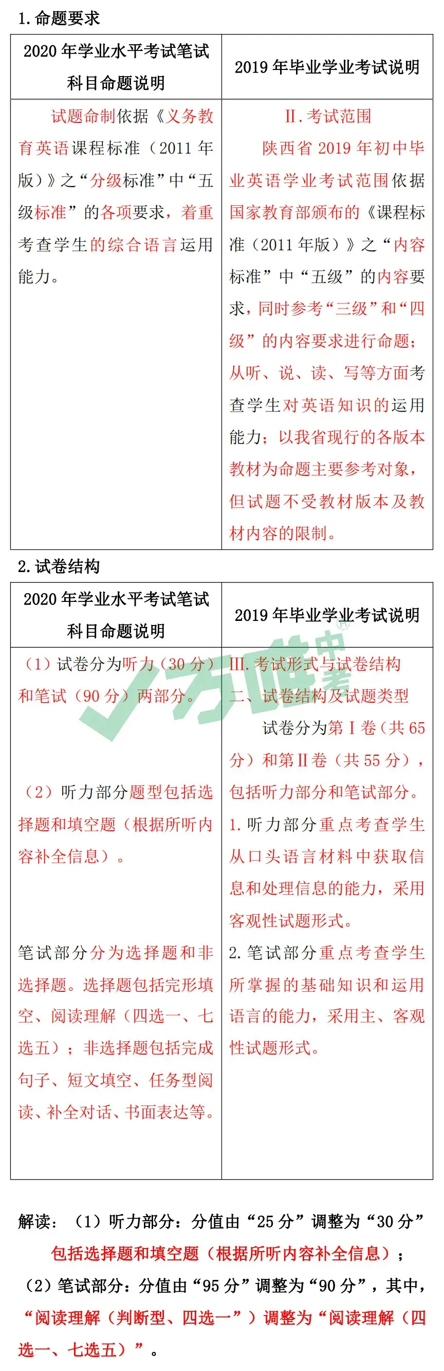 2020年陕西省初中学业水平考试笔试科目命题说明与陕西省2019年初中毕业学业考试说明对比,各科具体对比变化如下: