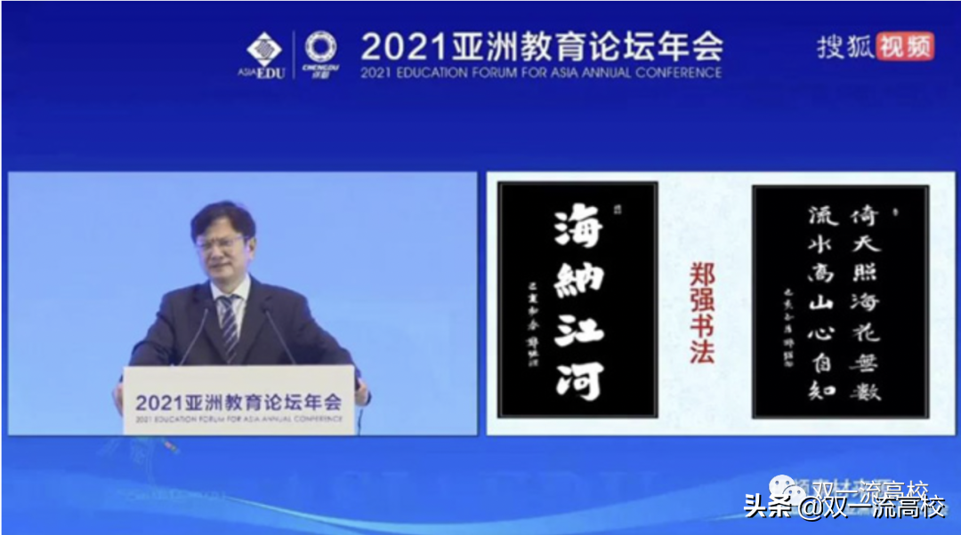 去年9月,在2021亚洲教育论坛年会上,郑强教授在开幕式演讲的报道中,就展示了他的书法作品。