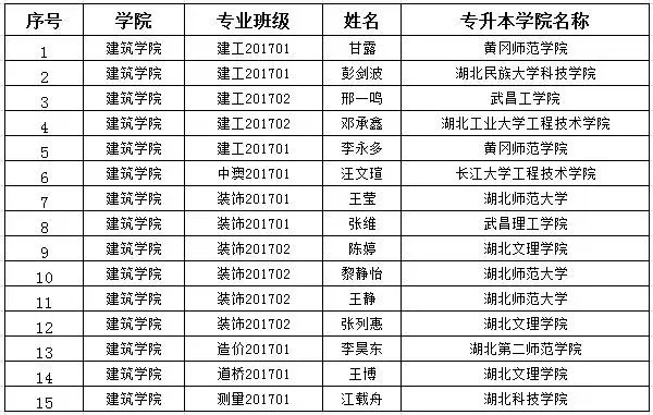建筑学院29名报考的学生中,有15名学生分别被湖北师范大学、黄冈师范学院、湖北文理学院、武昌工学院、湖北科技学院、湖北民族大学科技学院、湖北工业大学工程技术学院、长江大学工程技术学院等省内10所本科院校录取,录取率达51.7%。