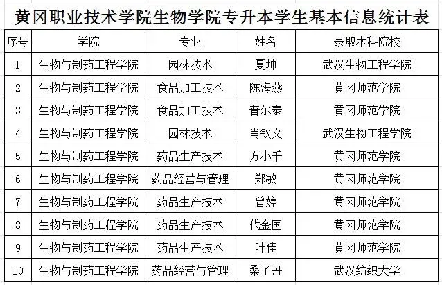 生物与制药工程学院共有11名同学报考,10名同学分别被黄冈师范学院、湖北纺织大学、武汉生物工程学院录取。