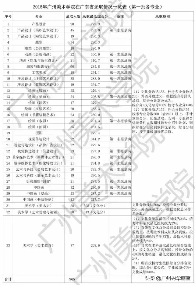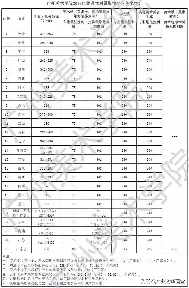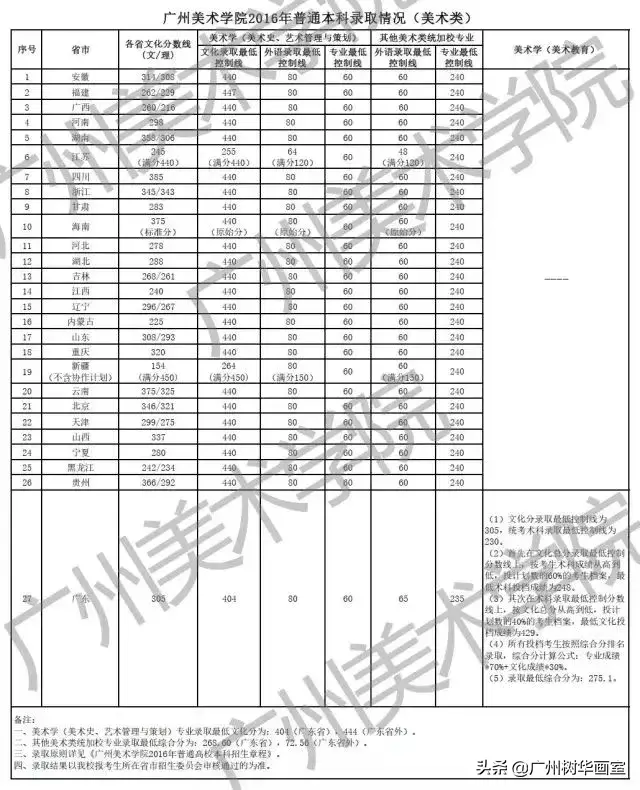 (6)书法学专业:文化成绩参照广东省美术类本科院校录取分数线,由我校自行划定。校考专业成绩和文化成绩达到我校规定的录取最低控制线,根据考生综合分从高到低,择优录取。如综合分相同,则按专业成绩择优录取。综合分计算公式:专业成绩×70%+文化成绩×30%。