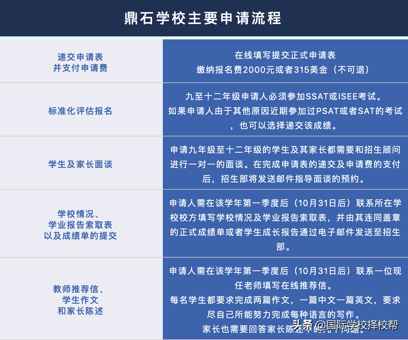 答:首先,鼎石是一所美式寄宿制学校,所以采用在美国通用的SSAT或ISEE考试。其次,鼎石对8、9、10三个年级的学生的英语水平要求更高,SSAT的难度和所要求的语言水平与鼎石的要求相吻合。
