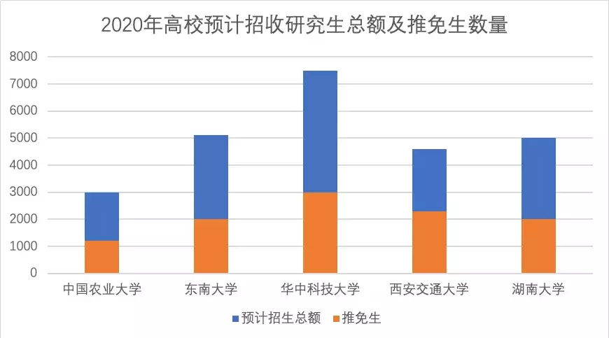 对于“双一流”学校而言,接收推免生是重要的招生手段之一。从已发布数据来看,2020年我国高校招生中,推免生名额仍在总招生名额中占据较大比例。例如,东南大学拟招收全日制硕士学位研究生(包括学术学位和专业学位)和非全日制攻读硕士专业学位研究生共计5100名左右,其中拟招收校内外推免生2000名左右;华中科技大学预计2020年接收推免硕士生人数约占全日制硕士招生总规模的50%;除此之外,西安交通大学和湖南大学的2020年拟招收人数中,推免生数量也占据了很大比重。