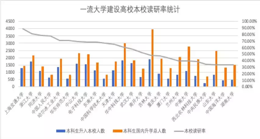 在一流大学建设高校中,大部分院校的“本科生升入本校人数”与“本科生国内升学总人数”比例差距较小,一部分考生最终在本科院校继续攻读研究生硕士学位。