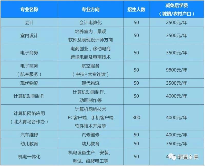 幼儿教育(120台钢琴与两大舞蹈室)、汽车维修(检测美容实训基地)、电子商务(跨境电商)、计算机网络应用(北大青鸟特色高薪班)、计算机动漫制作(动漫设计)、室内设计(独立艺术设计楼)、现代物流(与京东物流合作)、会计(传统热门专业)、机电一体化(海洋渔业)等。