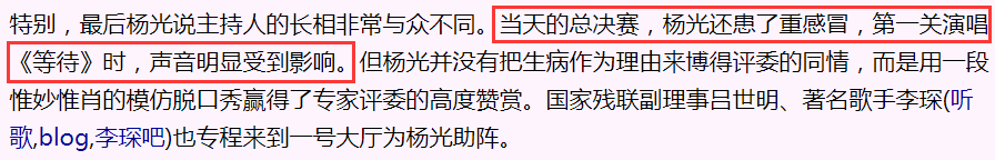 同一年,杨光还成了残奥会开幕式火炬手,开幕式两次献唱歌手。