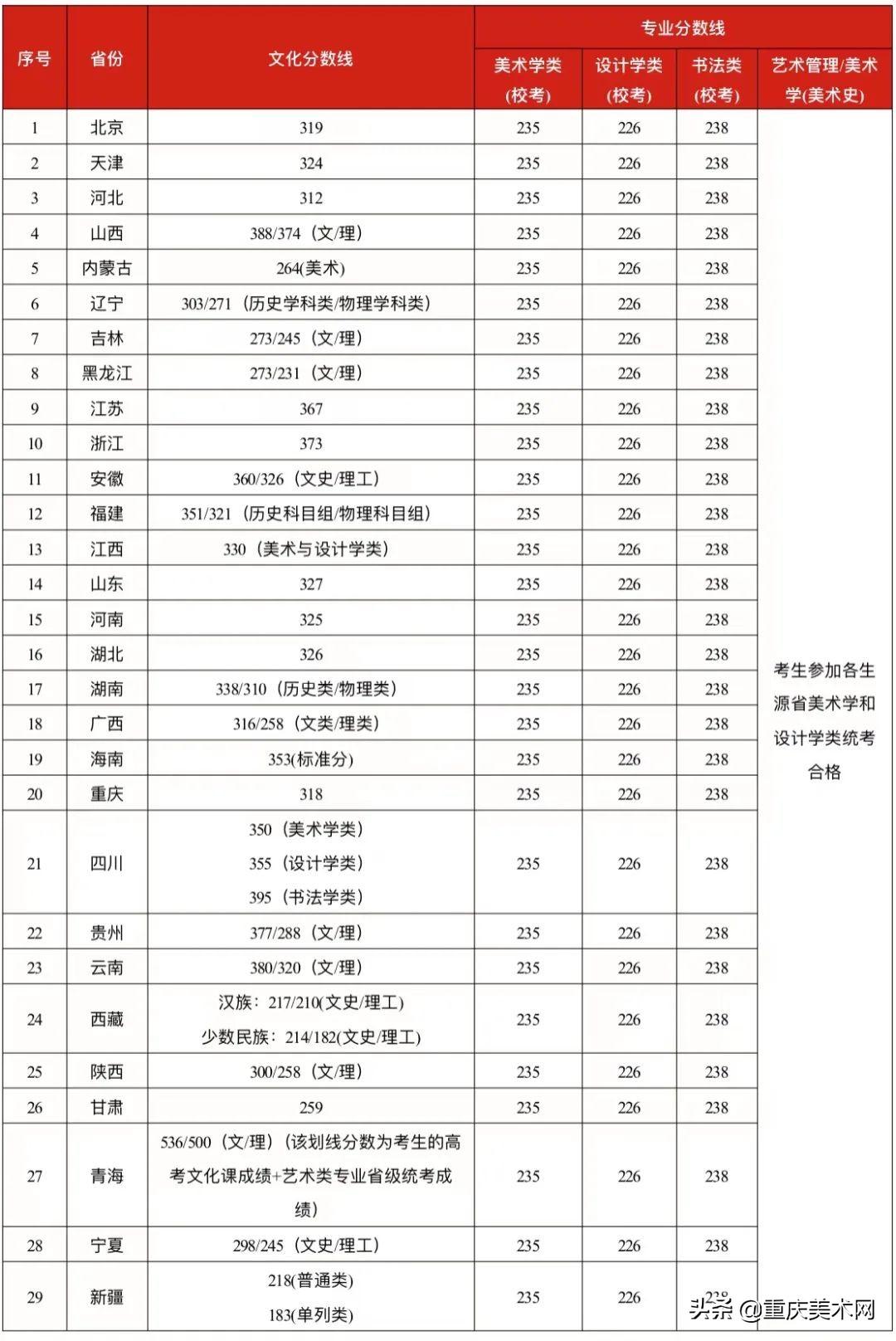 截至目前,九大美院已陆续公布2022年最低录取控制线、录取标准等,详情如下: