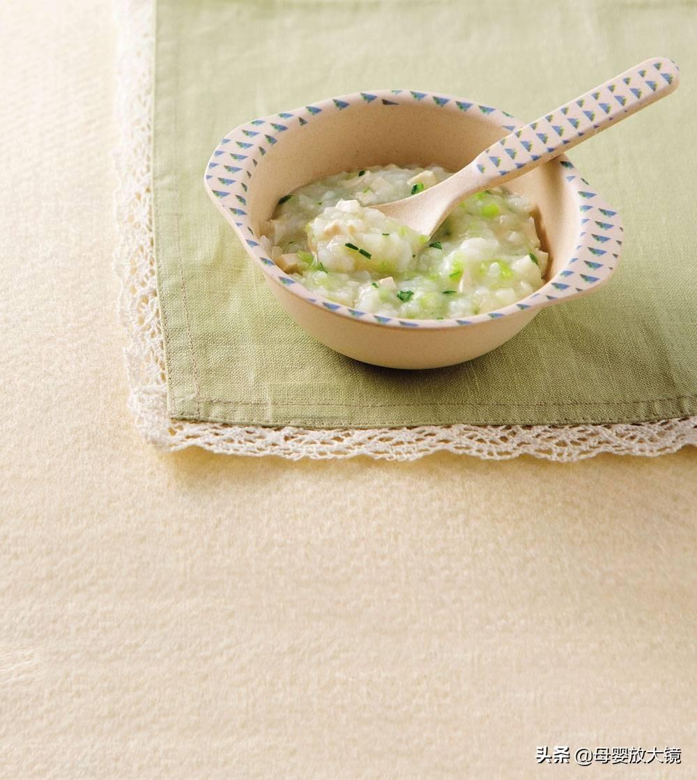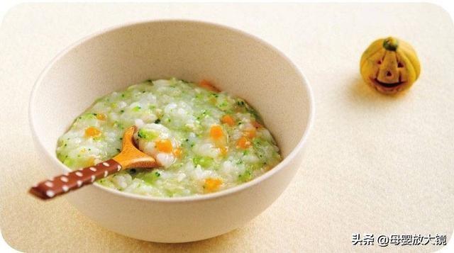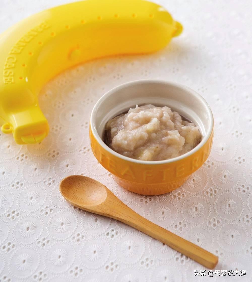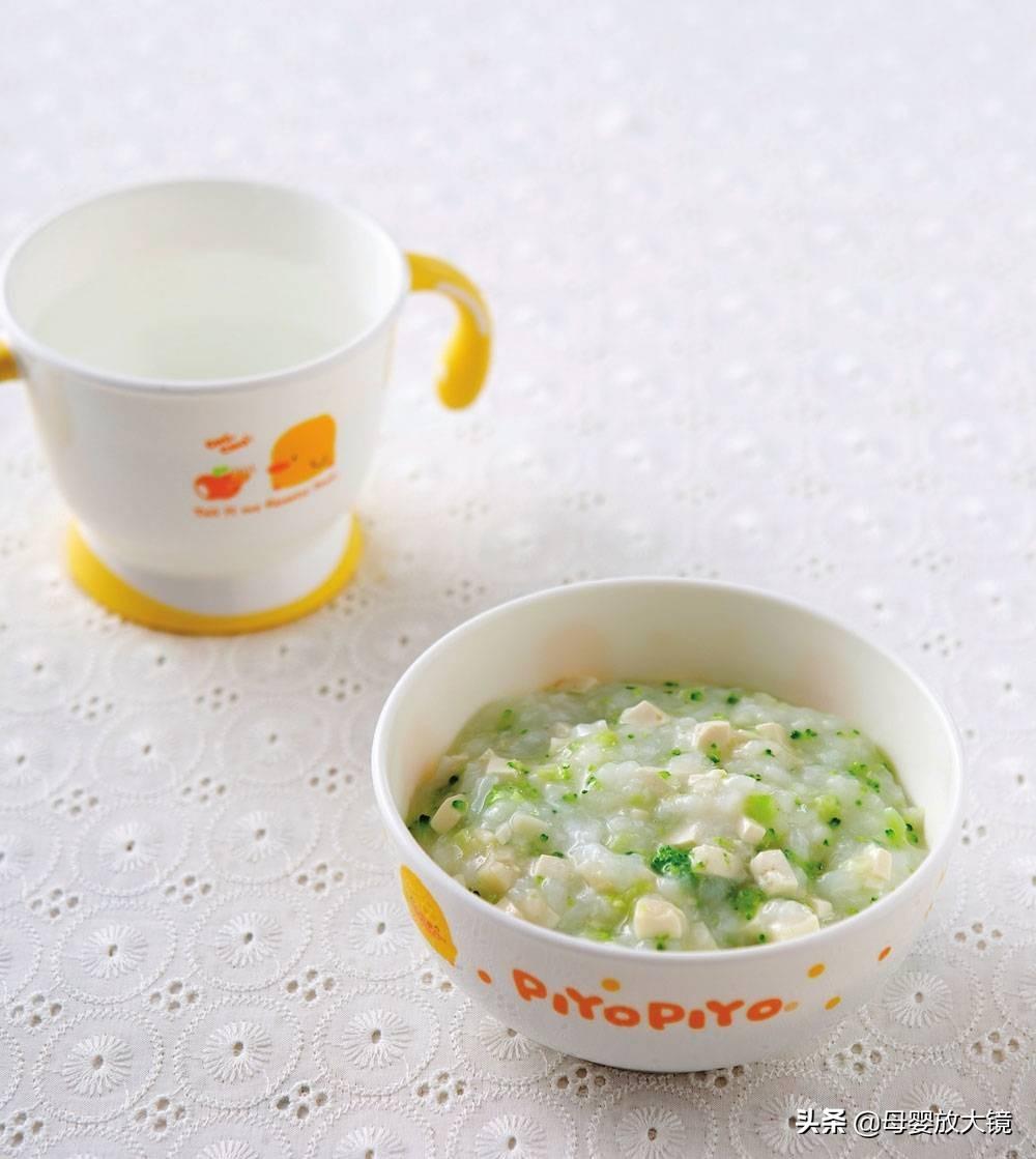 杏鲍菇切成0.5cm大的小丁,西蓝花取花部位切成0.5cm大的小丁,入滚水汆烫后备用。白米洗净泡水1~2小时后,煮成五倍粥。豆腐切成0.5cm大的小丁,烫过后再加入杏鲍菇、西蓝花与少许水煮熟,拌入稀饭,煮滚即可。10、香蕉马铃薯泥