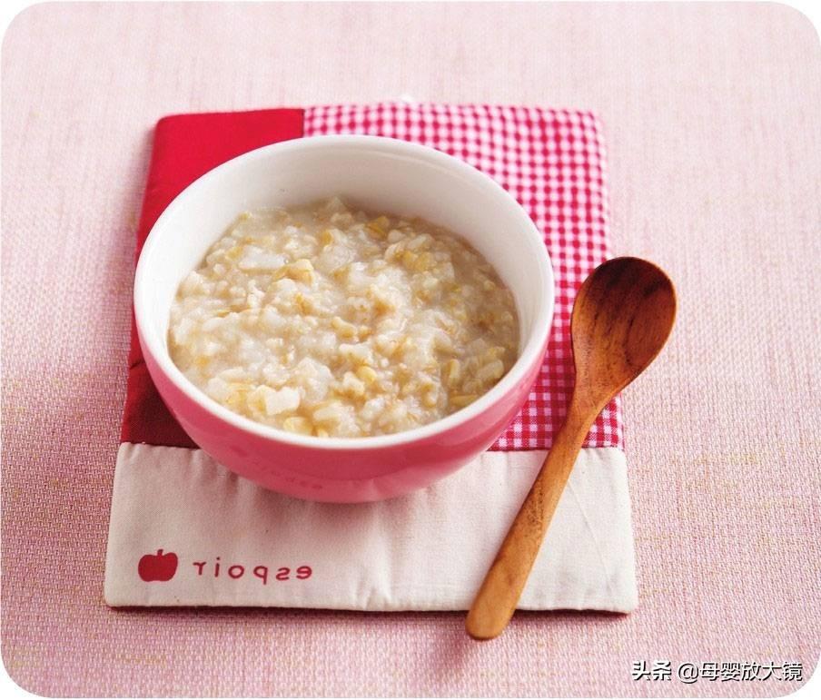 马铃薯削皮,蒸熟;洋葱切成0.5cm大的小丁,入滚水汆烫后备用;青江菜洗净,切成小段;鳕鱼切成细丁,入滚水汆烫后备用。白米洗净泡水1~2小时后,煮成五倍粥。豆腐切成0.5cm大的小丁,烫过后再加入马铃薯、洋葱、鳕鱼、青江菜与少许水煮熟,加入稀饭,煮滚即可。22、水梨燕麦粥