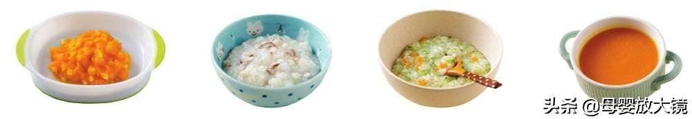 5~6个月大时,宝宝开始尝试泥状食物,逐渐进展到粗泥状,约9个月大时可以尝试约0.5cm大小的软质固体食物,从0.5cm慢慢增大到1cm或2cm,约1岁后就可以慢慢适应成人饮食。