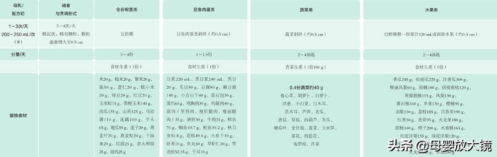 注:10个月母乳或配方奶3次/天;11个月母乳2次,配方奶3次/天;12个月母乳1次,配方奶2次/天