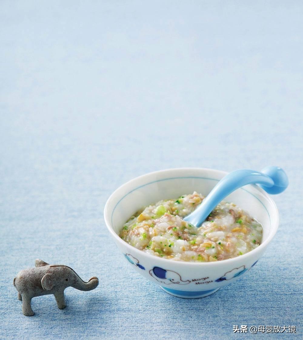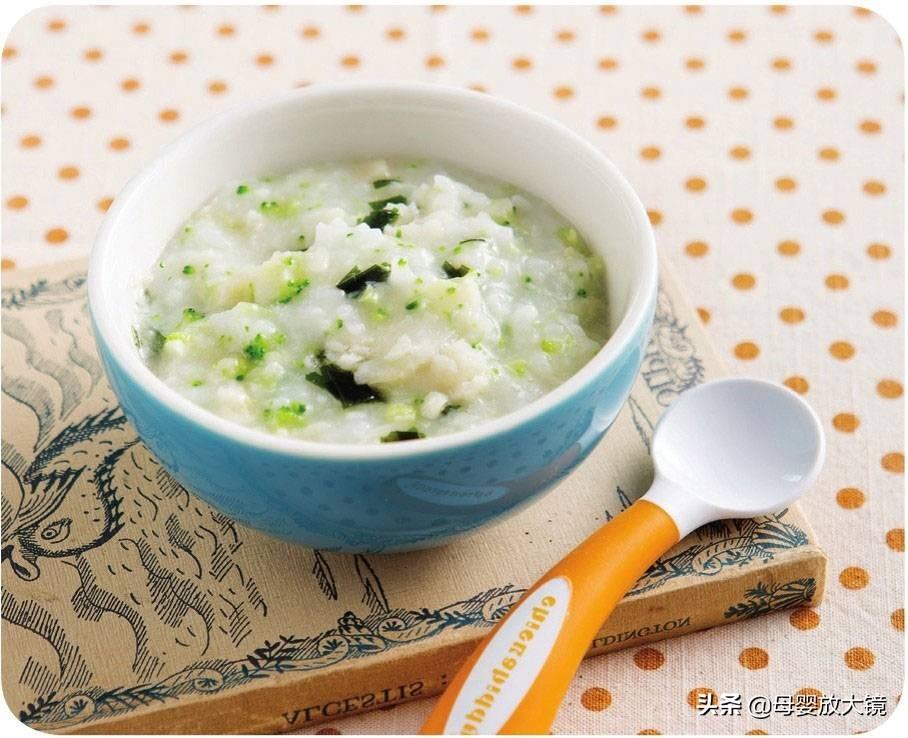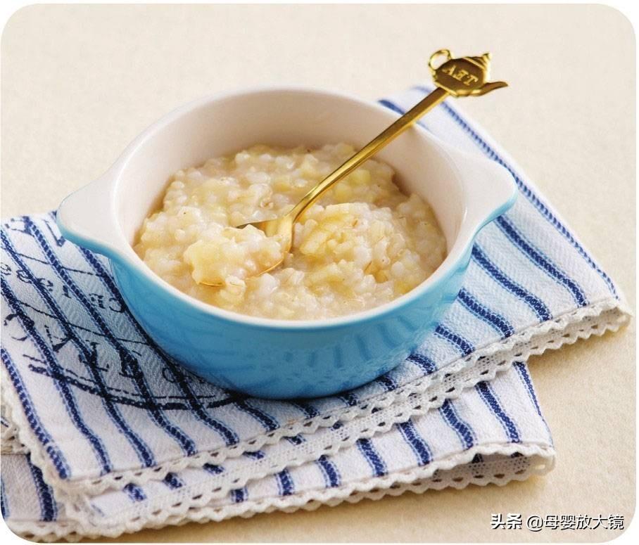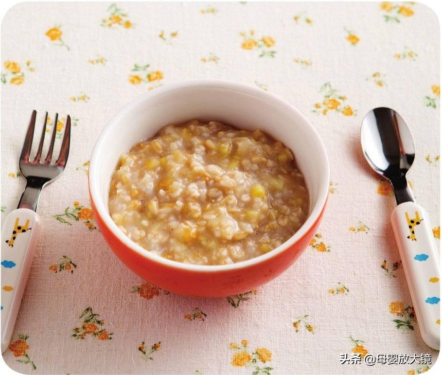 昆布泡水,与鳕鱼一同切成0.5cm大的小丁,分别入滚水汆烫后备用。西蓝花取花部位切成0.5cm大的小丁,入滚水汆烫后备用。白米洗净泡水1~2小时后,煮成五倍粥。将昆布、鳕鱼及西蓝花与少许水煮熟,加入稀饭,煮滚即可。13、香蕉苹果燕麦粥