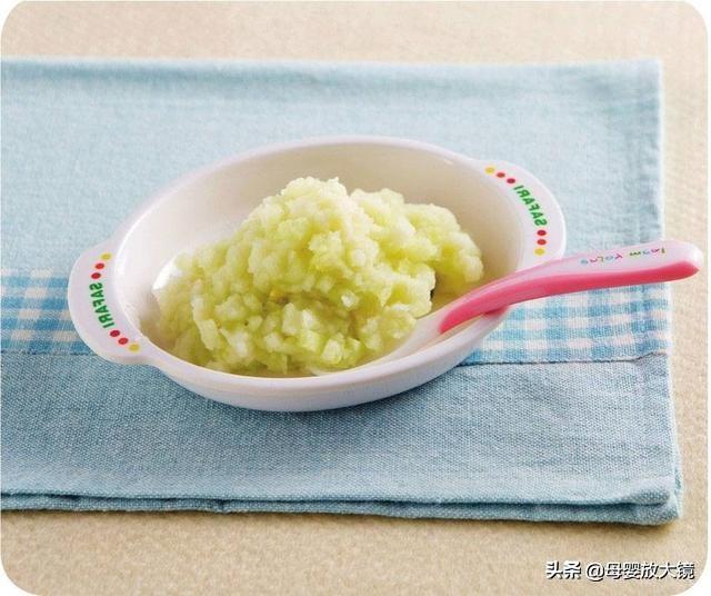 做法:马铃薯洗净后去皮,切成片,蒸熟压泥,稍微放凉。苹果切成约0.5cm大的小丁,加少量开水或母乳(配方奶)打成泥状,再拌入马铃薯泥里。