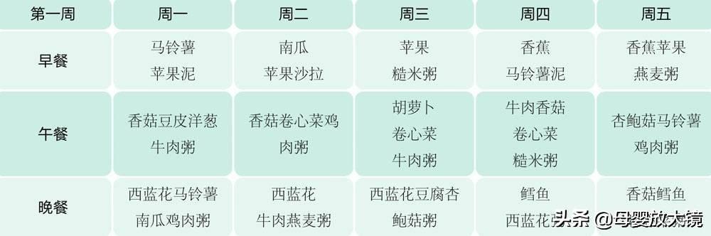 我们同样按照1周5天,设计了2周的食谱,供新手爸妈们参考。由于宝宝吃的菜量不多,因此,本菜单会以相同的食材变化菜色,减少1周买菜菜单的品项,同种类食物可以相互替换。若爸妈们想换成家中现有的食材或其他食材,则可参考表格进行替换。