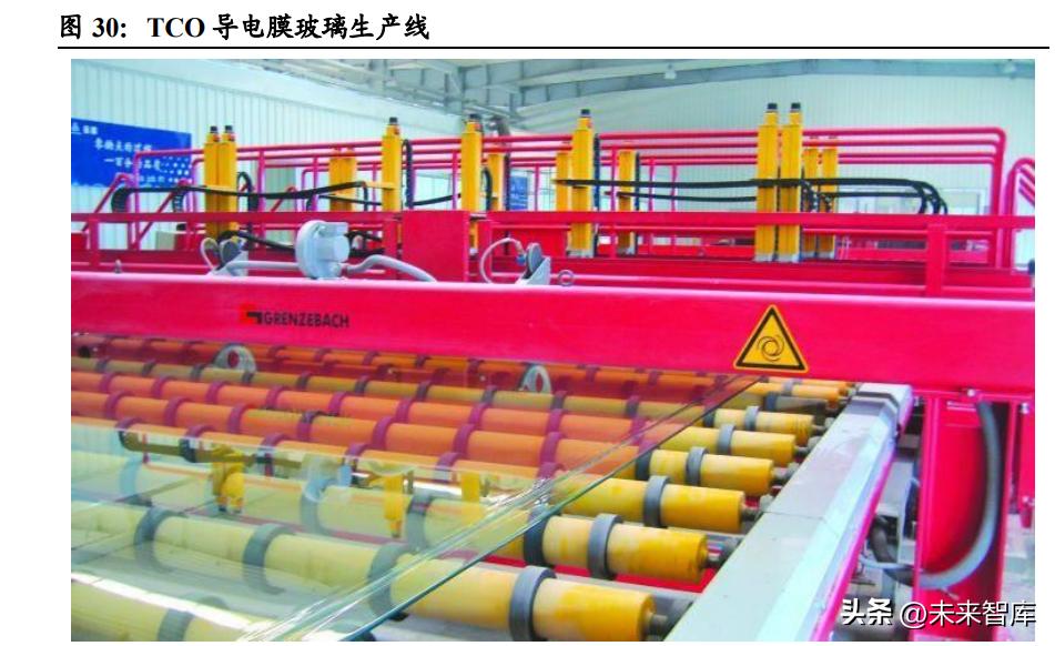 TCO 导电膜玻璃亦是技术迭代的重要方向。TCO 导电膜玻璃即透明导电氧化物镀 膜玻璃,是在平板玻璃表面通过物理或者化学镀膜的方法均匀镀上一层透明的导电 氧化物薄膜。TCO 导电膜玻璃具有对可见光的高透过率和高的导电率,是第二代的 碲化镉薄膜电池和第三代的钙钛矿电池组件的重要配件。由于在线设备需定制+浮 法生产线的改造复杂+工艺参数需尝试,在线镀膜竞争壁垒较高。