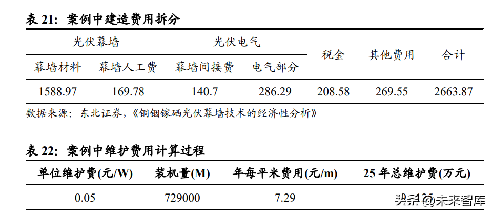 现有光伏幕墙已具备较好的经济性能。《铜铟镓硒光伏幕墙技术的经济性分析》针对 新型的铜铟镓硒(CIGS)光伏幕墙技术,以沈阳地区光伏建筑应用为例,从全寿命周 期角度进行经济性分析,其中全寿命周期成本为 848.06 万元,全周期收益为 1370.77 万元,外部效益为 533.85 万元,综合来看光伏幕墙已具备较好的经济性能。