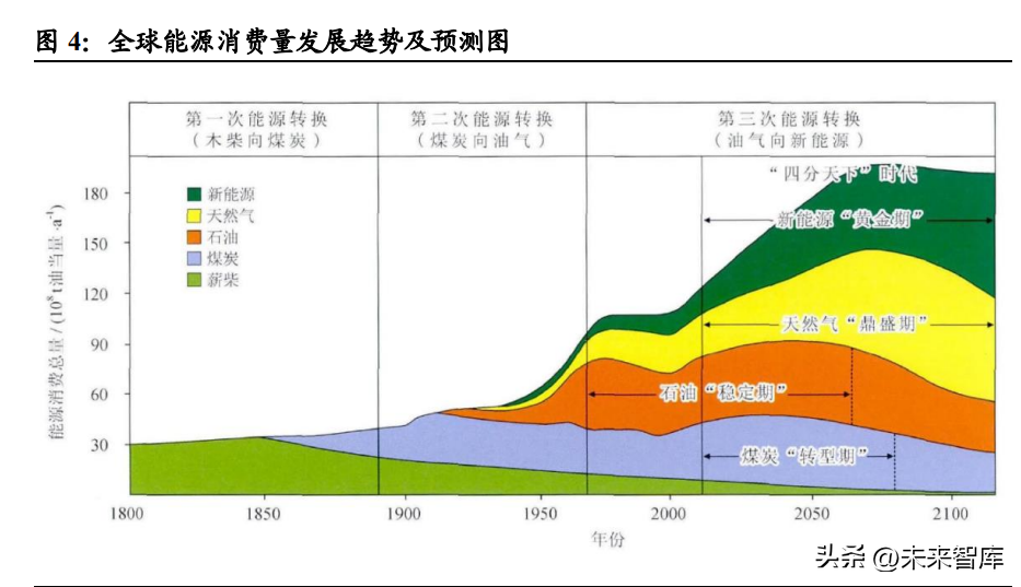 碳中和的实现依赖于能源结构的转变,绿色电力将逐渐取代油气成为主要能源。根 据中国科学研究院院士邹才能等人的研究,历史上的能源变革已经经历了木柴向煤 炭、煤炭向油气的转换,目前正处于油气向新能源转换的时期。回顾过去,人类最 早采用能源是木柴,满足了烹饪、取暖等基本需求。随着技术的进步,蒸汽技术、 燃煤发电技术的发明极大地促进了煤炭产业的发展,煤炭逐渐取代木柴成为主流。 20 世纪中期,内燃机技术快速发展,造就了油气产业和汽车产业的共同繁荣,石油 与天然气的消费总量占比迅速提升。