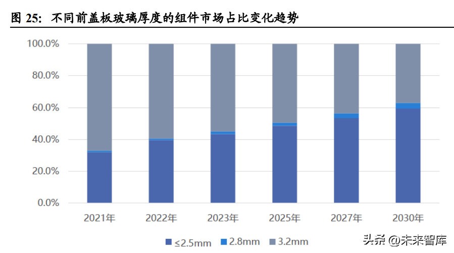 受性能限制,光伏玻璃薄片化与大型化兼得的难度较大。随着厚度的减小,超白压 延玻璃及浮法玻璃的抗冲击强度与抗弯强度逐渐减小,而大型化会导致玻璃受荷力 矩增大,因此两者相结合会对光伏玻璃的力学性能产生更为不利的影响。这也可以 用于解释当前分布式 2mm 双玻组件最大单片组件功率可超过 600 瓦,但分布式 1.6mm 双玻组件功率仅能达到 400 多瓦。因此我们认为,大尺寸光伏玻璃与超薄光 伏玻璃的应用场景将出现分化,前者因较高的单片功率将更多地应用于集中式光伏 电站与受力条件较优的分布式电站;后者因更轻的质量(若按 1.6mm+1.6mm 双玻 组件与 2mm+2mm 双玻组件进行对比,单平米相差重量约为 2kg,约占整体光伏系 统重量的 10%)将更多地应用于受力条件稍差的分布式电站。