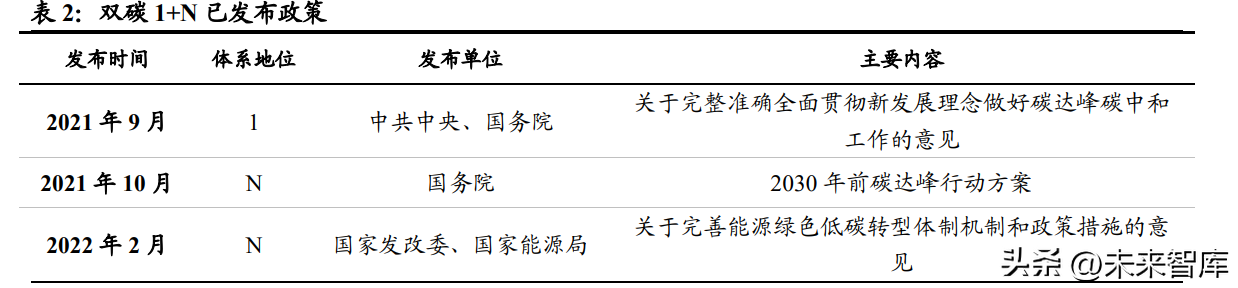 双碳“1+N”政策陆续出台,展示了中国降碳的决心与信心。2021 年 9 月 22 日, 中共中央、国务院下发《关于完整准确全面贯彻新发展理念做好碳达峰碳中和工作 的意见》,简称《意见》,是碳达峰碳中和“1+N”政策体系中的“1”,明确了 3060 双碳目标,即中国到 2030 年二氧化碳排放量达到峰值并实现稳中有降,到 2060 年 实现碳中和的目标。2021 年 10 月 24 日,国务院印发《2030 年前碳达峰行动方案》, 简称《方案》,是碳达峰阶段的总体部署,是“N”中为首的政策文件。《方案》在与 《意见》保持目标和方向衔接的同时,将 2030 年前任务更加细化。其中,将非化石 能源消费比重达 20%的目标达成时间提前 5 年至 2025 年。