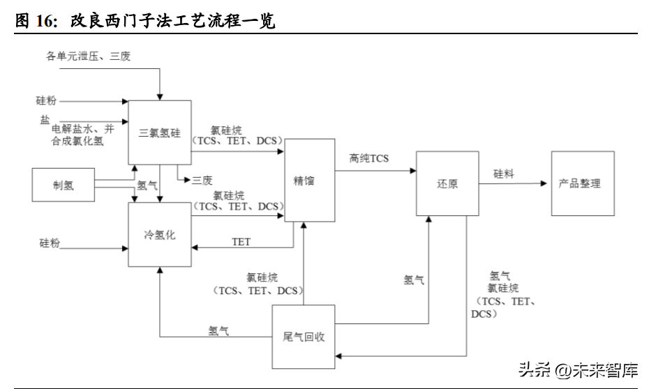 改良西门子法是用氯气和氢气合成氯化氢,氯化氢与工业硅粉在一定的温度下生产 三氯氢硅,然后对三氯氢硅进行分离精馏提纯,提纯后的三氯氢硅在还原炉内进行 化学气相沉积反应生产高纯多晶硅,其主要是在西门子法基础上增加了尾气回收和 四氯化硅氢化工艺,实现了生产过程的闭路循环和原料的循环利用,解决了西门子 法还原过程单次转化率低的问题,提高了物料使用率,降低了生产成本,同时避免 副产品直接排放污染环境。