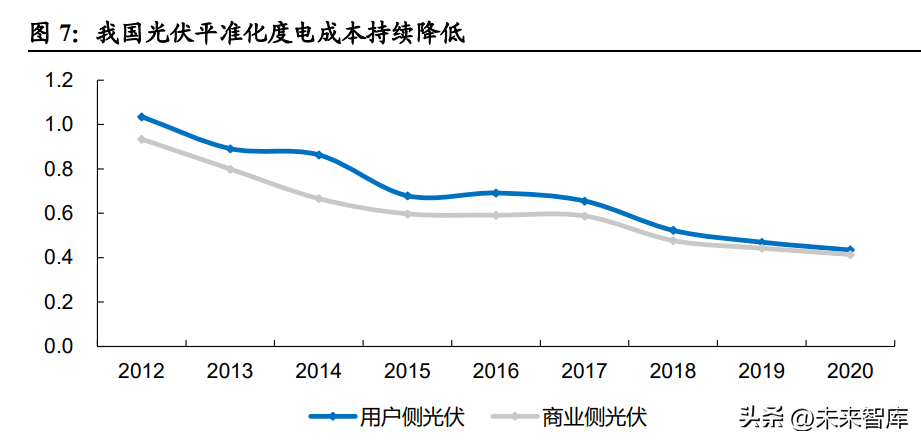 全行业降本增效下,光伏平准化度电成本持续降低,目前已经接近燃煤标杆基准电 价水平。当前常用的电力成本为平准化度电成本(LCOE),就是对项目生命周期内 的成本和发电量进行平准化后计算得到的发电成本,即生命周期内的成本现值/生命 周期内发电量现值。全行业降本增效下,我国商业侧光伏的平准化度电成本从 2012 年的 0.93 元/千瓦时,下降至 2020 年的 0.41 元/千瓦时;用户侧光伏的平准化度电 成本从 2012 年的 1.03 元/千瓦时,下降至 2020 年的 0.43 元/千瓦时。光伏发电的度 电成本已经接近燃煤标杆基准电价水平,使得绿色电力的大规模应用已经逐步具备 现实的经济性。