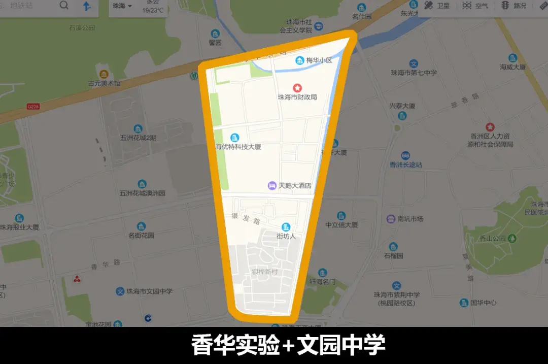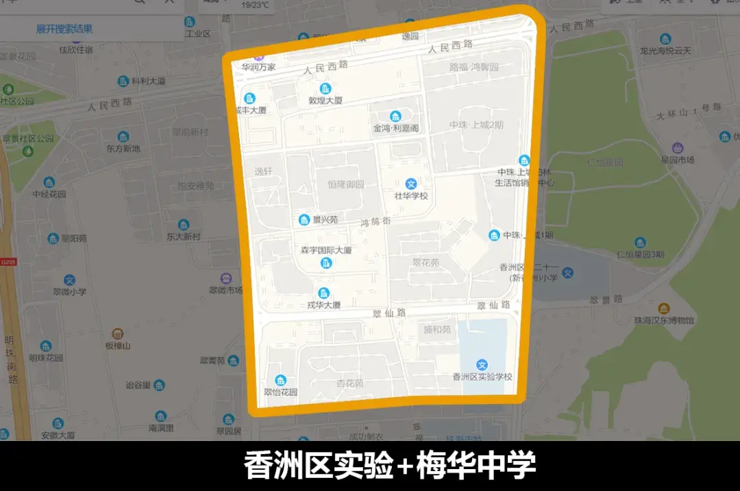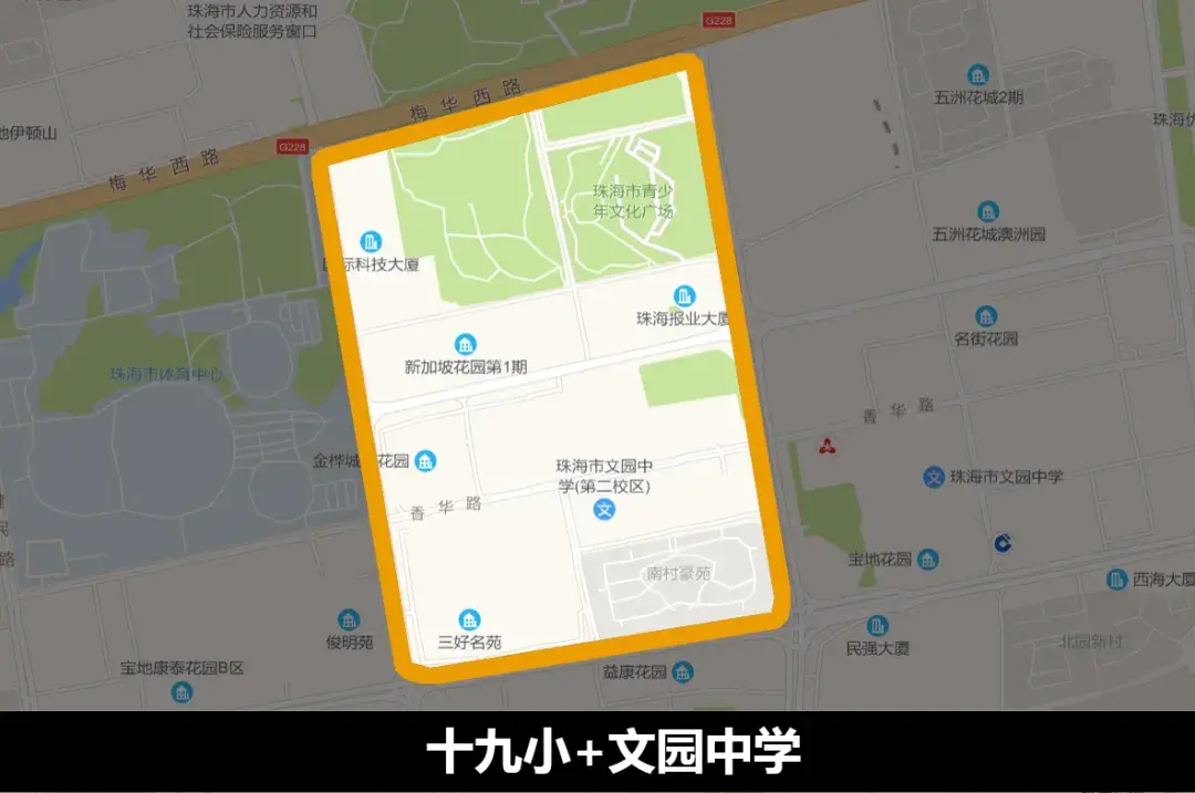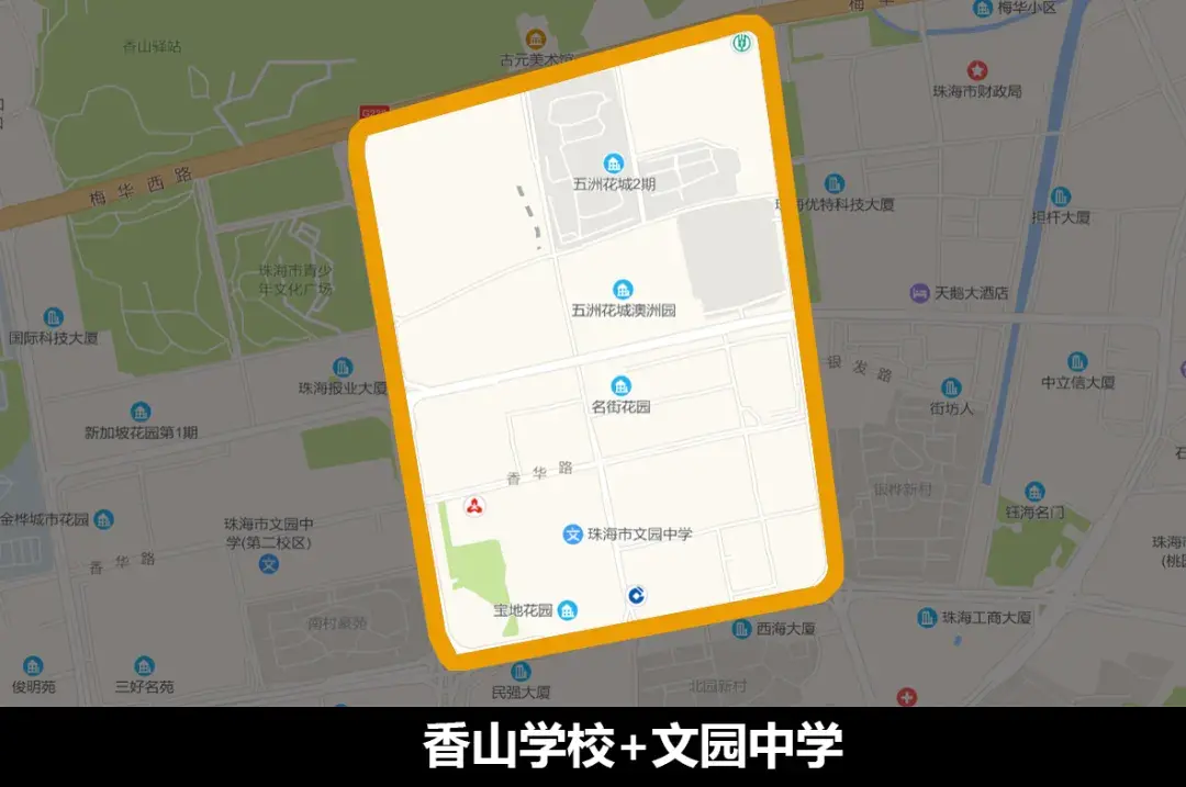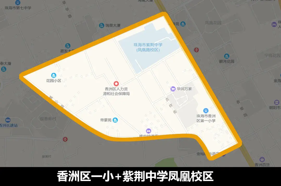 备注:紫荆中学凤凰小学原属于珠海一中初中部,因此该学区俗称一中一小学区。文园中学为二中初中部,因此文园中学学区也俗称为二中学区。
