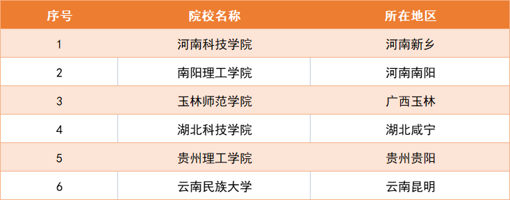 如图所示,这6所大学分别是河南科技学院、南阳理工学院、玉林师范学院、湖北科技学院、贵州理工学院、云南民族大学。