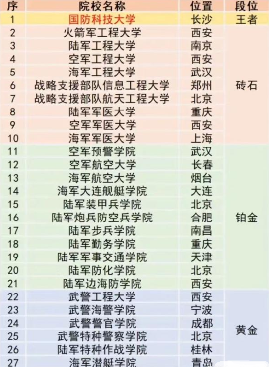 要说国防科技大学是“王者级别”的高校,那陆、海、空军工程大学就是“星耀阶段”的高校了,三所大学分别为南京、西安、武汉,超一本线 70~100分的学生都有机会被录取。