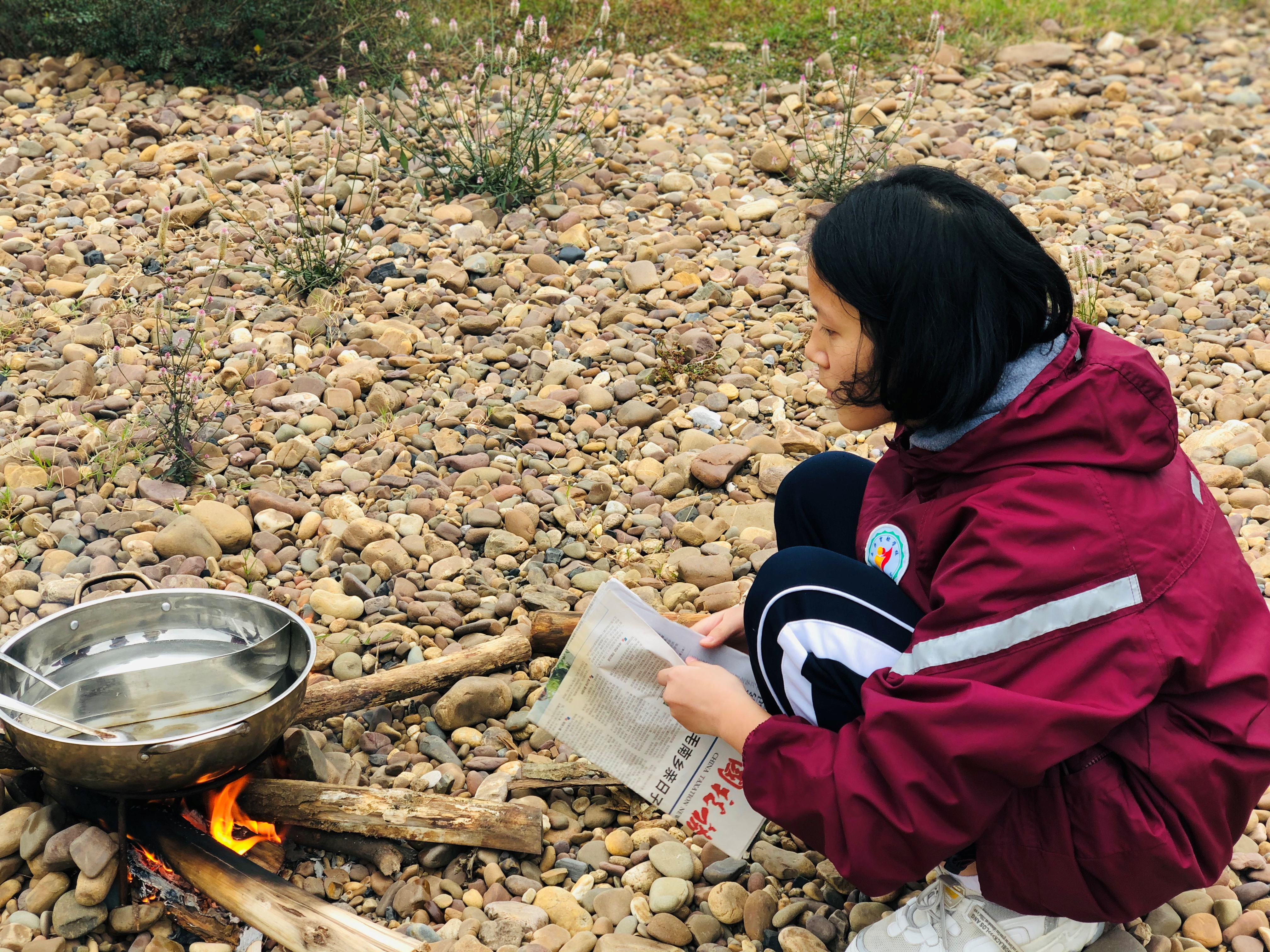 寻视了一圈,“别有用心”地挑选了几块适合的柴火,像工程师似的熟练架起一个主框架,在组员的帮助下,东凑西找,寻了几把蓬草和薄木片,小心翼翼地塞进主干底,以薄木片引火,轻放到干草面上。今个儿风很大,怪冷的,灶里的火也无精打采,瑟瑟地燃烧着。“把报纸塞进去试试吧,这个容易点着。“组员也不闲着,东翻西找地想办法,找燃料。我们一张张地把报纸推进火,却也短暂地释放它的热情,一秒化成了尘灰。要是有树油就好了,我无声地叹息,祈祷奇迹降临。
