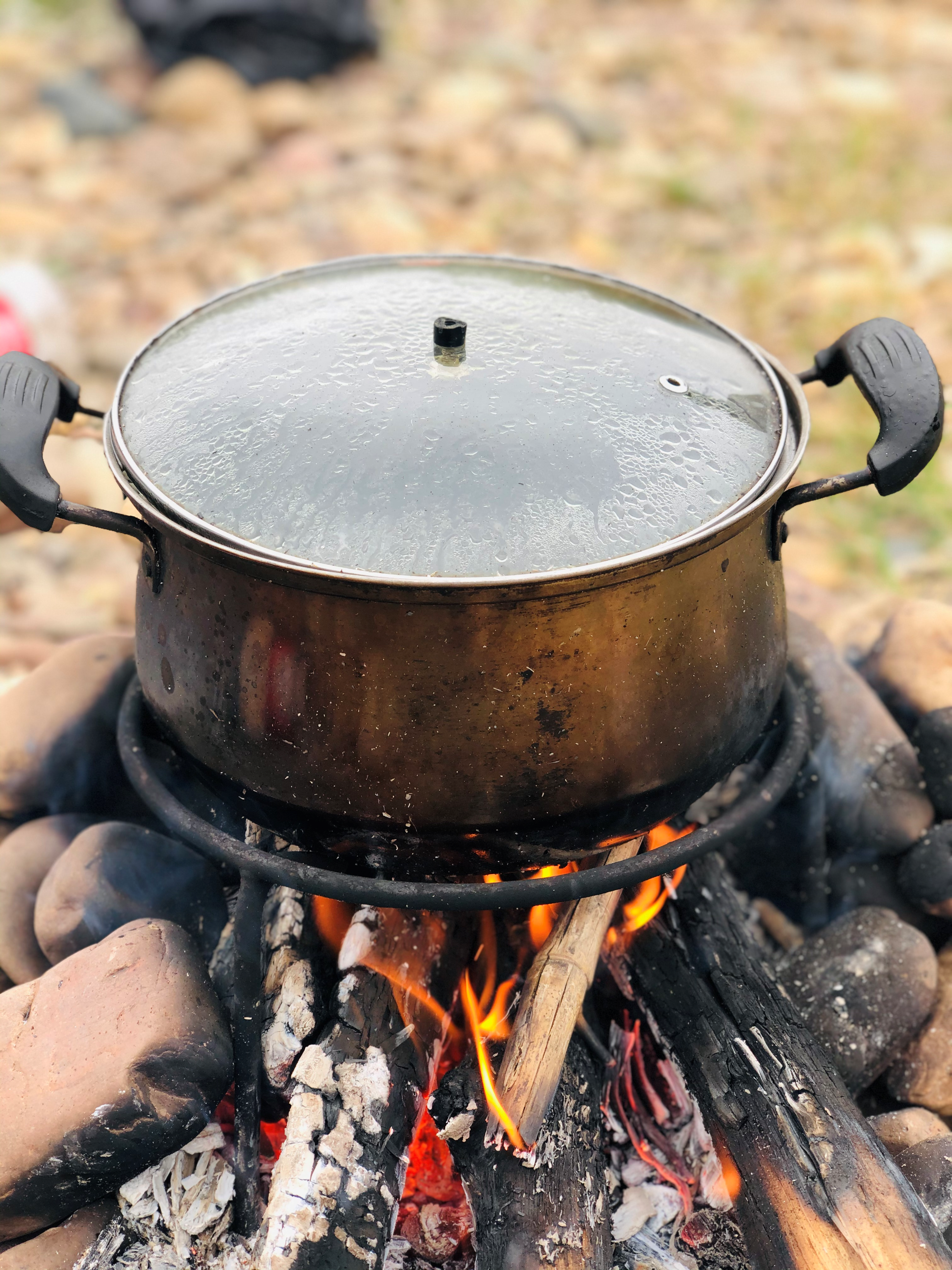 继续生火,我胆子不大,只好认怂,让组员代劳,站在一旁安静观赏。柴油如春雨一般让火苗猛烈生长起来,时不时溅起一群火星。我们迅速架上铁锅,该让位给大厨一展身手了。火锅发出一阵阵香味,上面吐出一个个热腾腾的气泡。肉丸,小白菜,牛肉轻飘飘地浮在汤面,翻滚着,让人垂涎欲滴,大家都迫不及待地尝上了。