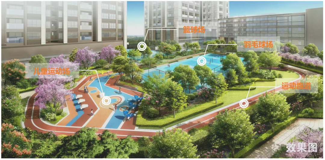 约5900㎡室内外运动共享空间(涵盖运动跑道、羽毛球场、篮球场、儿童运动场等),规划社康中心及老年人日间照料中心,满足全龄段大城生活